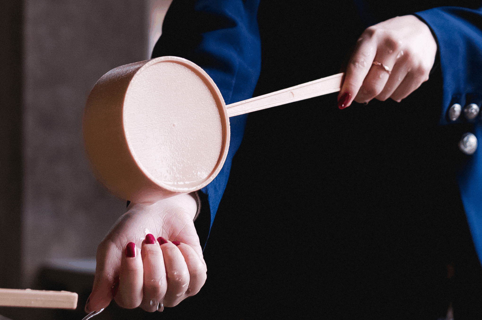 Pour some water into your left hand to rinse your mouth (do not touch the ladle to your mouth directly)